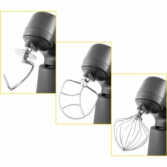 | Плюсы: | Миксер металлический, тёмно серого цвета, выглядит круто. Есть пластмассовые крышка, лопатка и сепаратор для яиц. Насадки (венчик, лопатка, крюк) и чаша металлические. Расстояния от насадок до дна чаши несколько миллиметров. Чаша большая, но довольно лёгкая, с удобной ручкой. |