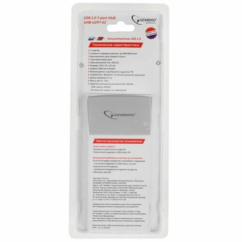 UHB-U2P7-02 Концентратор USB 2.0 Gembird Uhb-u2p7-02, 7 портов, питание, блистер