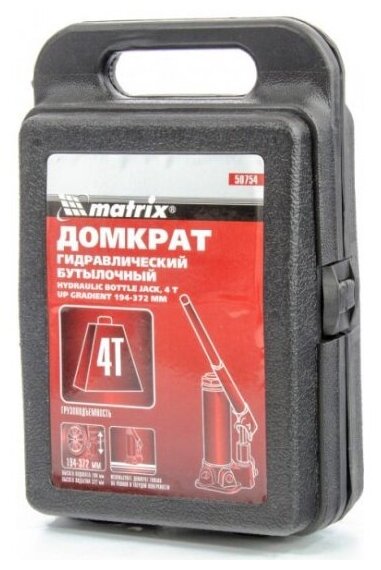 Домкрат гидравлический бутылочный, 4 т, высота подъема 194-372 мм, в пластиковый кейсе Matrix
