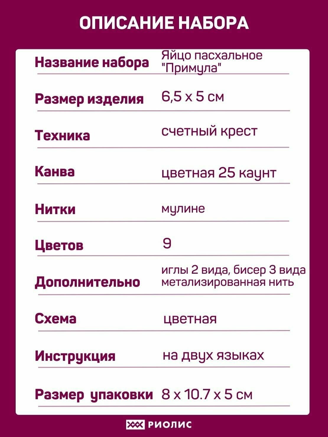 Набор для вышивания крестом Риолис, вышивка крестиком "Яйцо пасхальное "Примула", 6,5*5см, В195