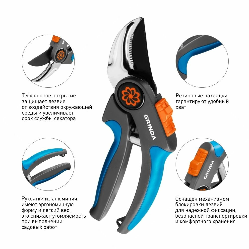 Секатор GRINDA 205 мм, c двухкомпонентными рукоятками, плоскостной, садовый 423455 / Сучкорез для сада