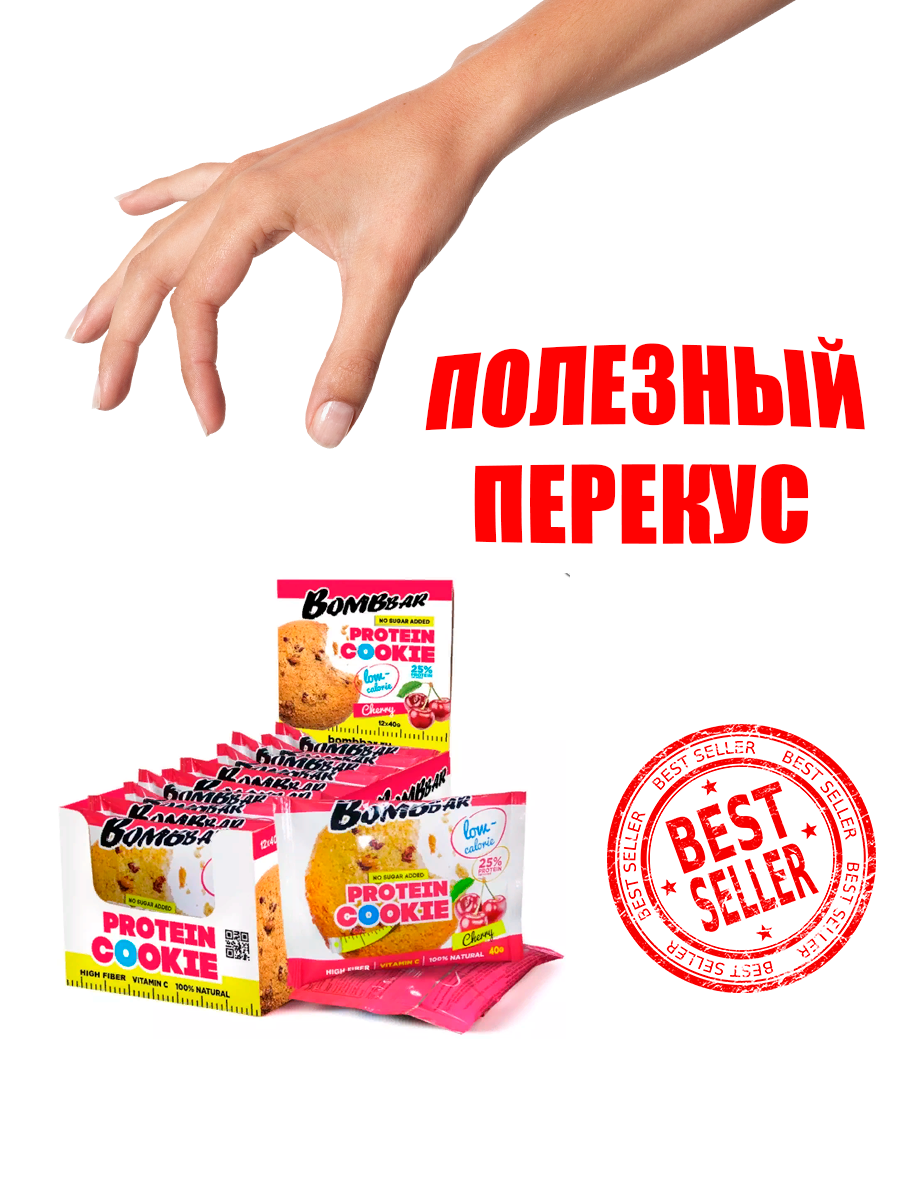 Протеиновое печенье низкокалорийное Bombbar Protein Cookie без сахара, Вишня (12шт по 40г)