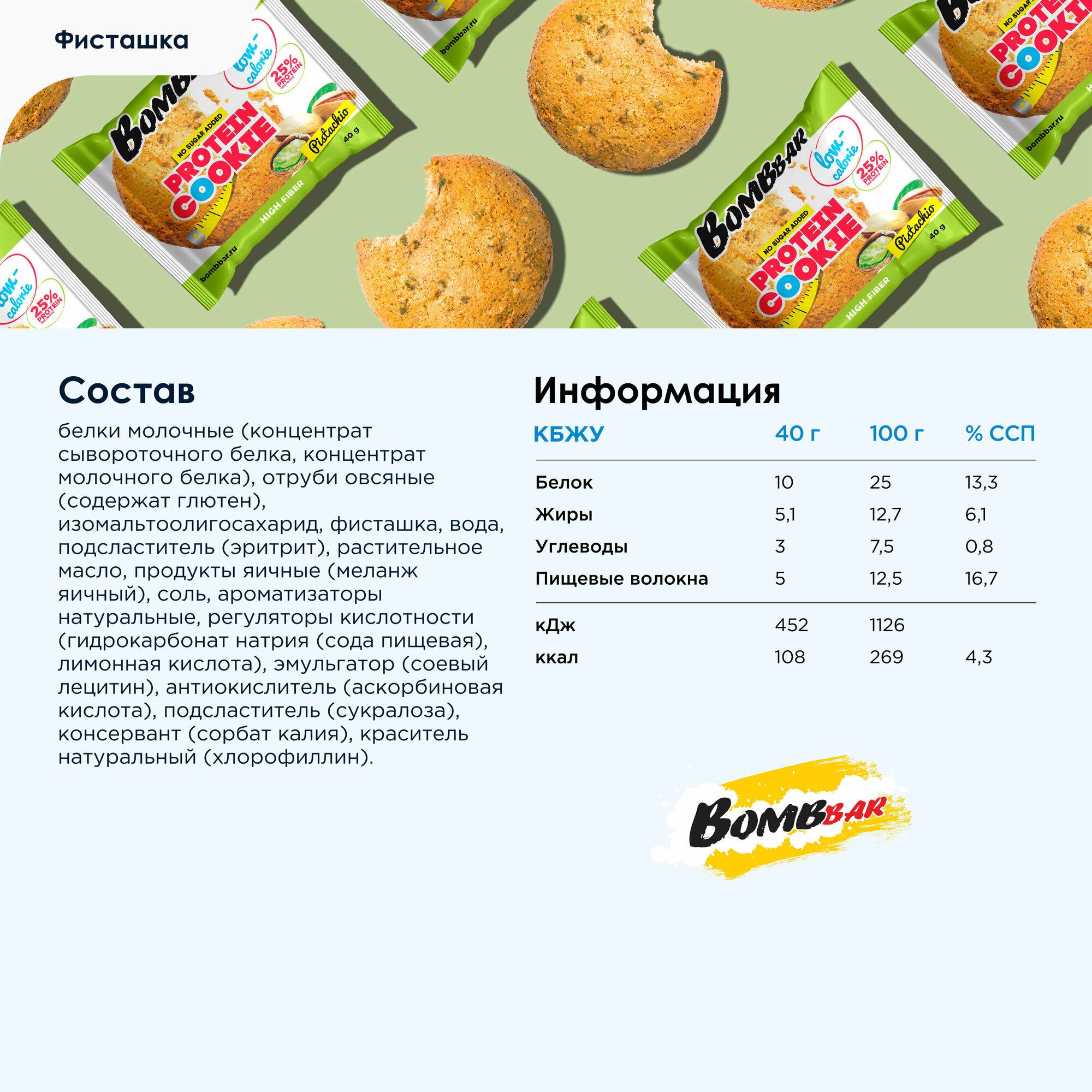 Bombbar, Протеиновое печенье, упаковка 12шт по 40г (фисташковый)