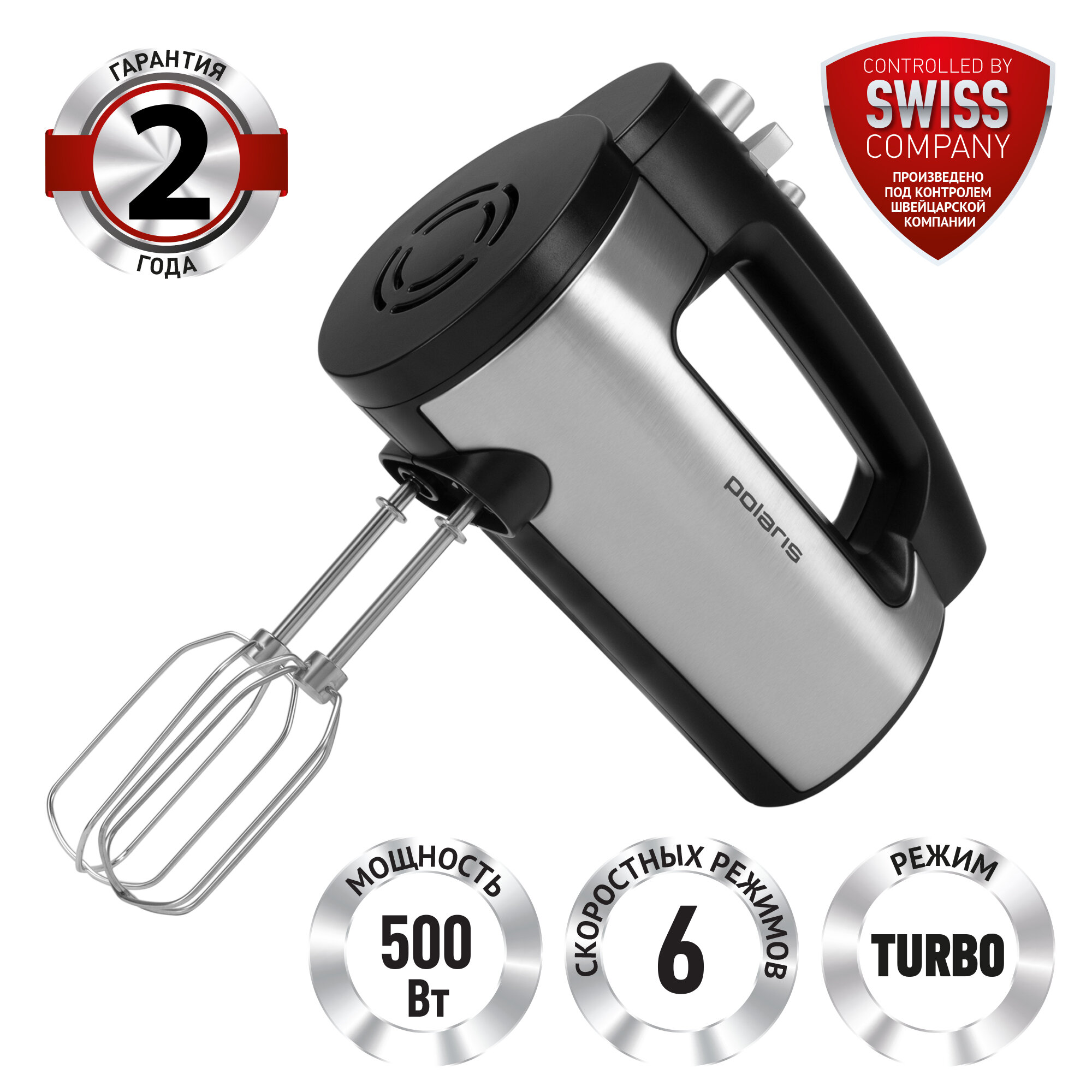 Миксер POLARIS PHM 5009A, 500 Вт, 6 скоростей, 2 венчика, 2 крюка для теста, черный, 25323