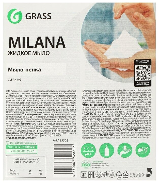 Жидкое Мыло-Пенка Milana 5Кг. Grass 125362, Шт GraSS арт. 125362