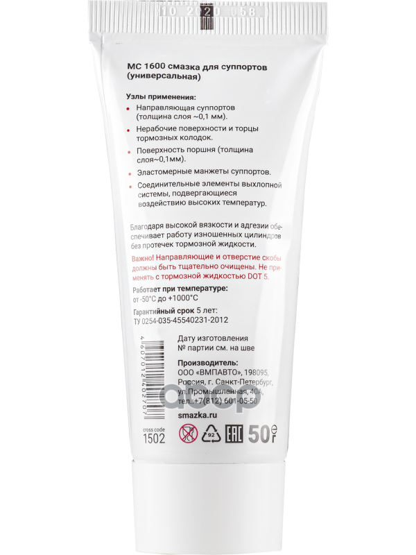 Смазка Мс-1600 Для Суппортов 50 Г, Туба Вмпавто 1502 ВМПАВТО арт. 1502