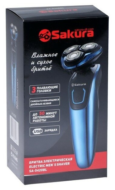 Электробритва Sakura Sa-5420bl, роторная, 3 головки, сухое/влажное бритьё, триммер, АКБ Sakura 93005 .