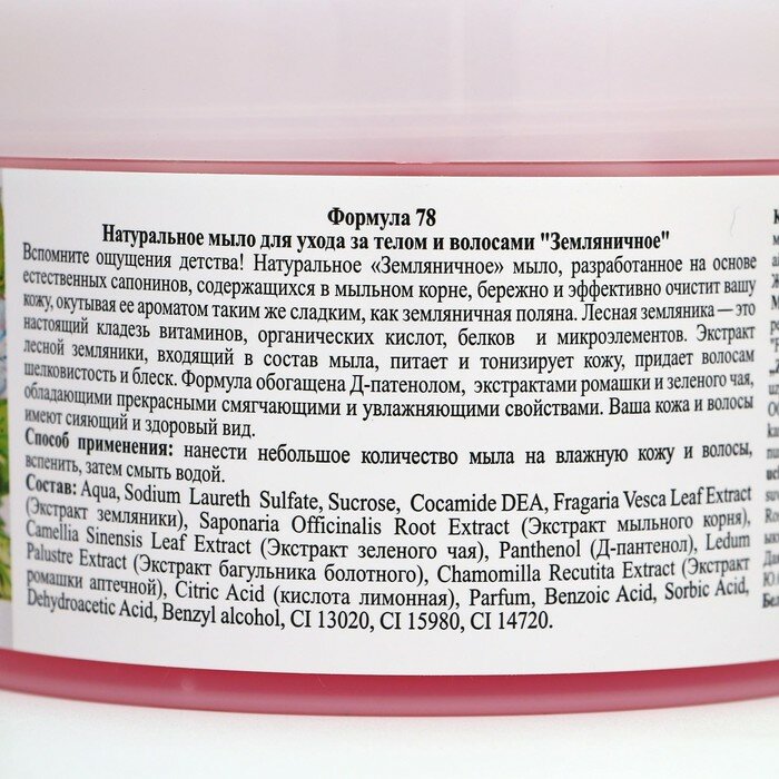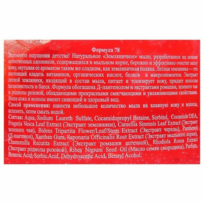Запах, большой объем, многофункциональность, шикарная пена Недостатки: Ненатуральный состав Запах настоящей земляники, пена пушистая, нежная. Много применений. Я использую как: 1. Гель/мыло для душа 2. Пена для ванной 3. Гель для бритья Жаль, производитель обманывает насчет натуральности |