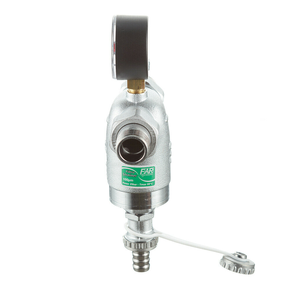 Фильтр Far 1/2" НР-НР, с манометром, 100мкм, Max: 95 °C, 25 бар
