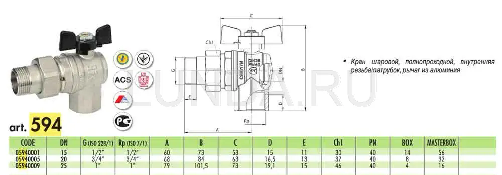 Кран шаровой полнопроходной угловой Bugatti Oregon 594 - 1/2' (ВР/НГ, PN40, ручка-бабочка черная) 05940001