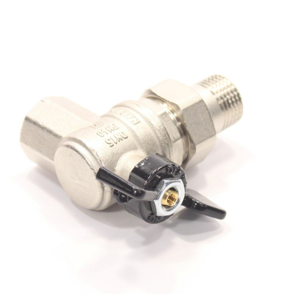 Кран шаровый угловой Bugatti Oregon 05940 с накидной гайкой для бытовой техники серебристый Ду 15 (1/2")