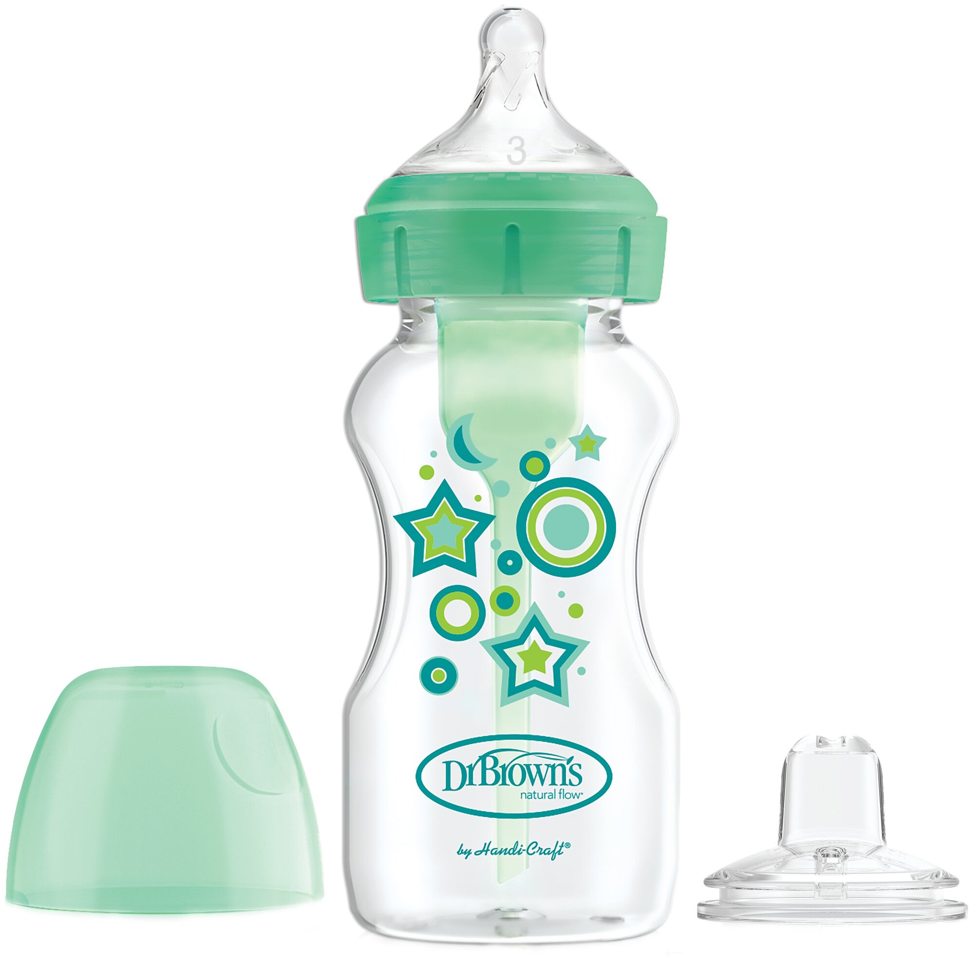Купить Набор переходный антиколиковая бутылочка Options+ с широким горлышком 270 мл с соской от 6-ти мес. и носиком для питья Зелёные Звёздочки
