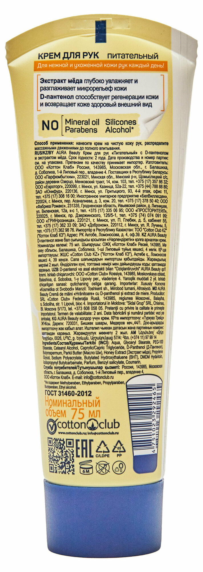 Крем коттон клаб Питательный с пантенолом и экстрактом меда для рук, 75 мл