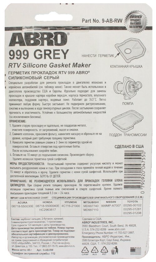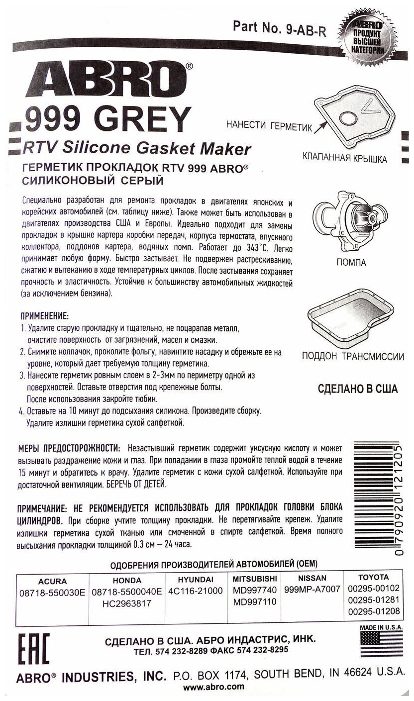 Герметик Abro (999) Серый (85гр.) Сша Герметик Прокладка Серый Abro 999 Сша ABRO арт. 9ABR