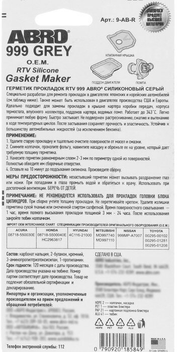 Герметик прокладок силиконовый ABRO OEM серый 999, 85 г 9-AB 2717443 .