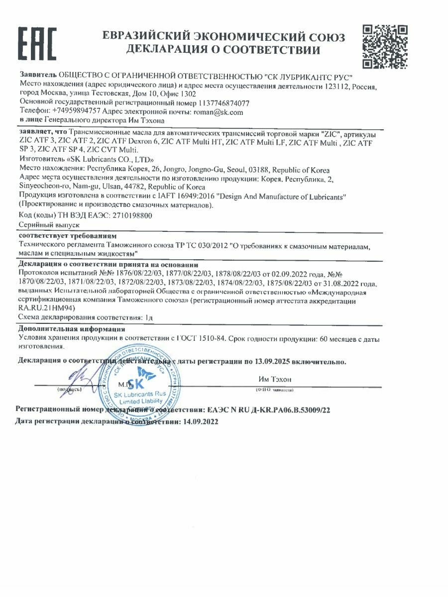 Масло трансмиссионное zic 1л синтетика atf sp 3 (hyundai/kia/mitsubish)