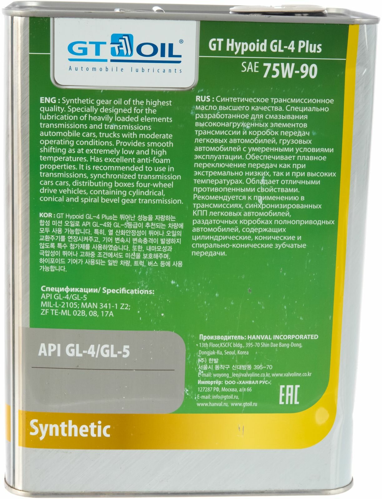 GT OIL Масло Hypoid GL-4 Plus, SAE 75W-90, API GL-4/GL-5, 4л 8809059407998