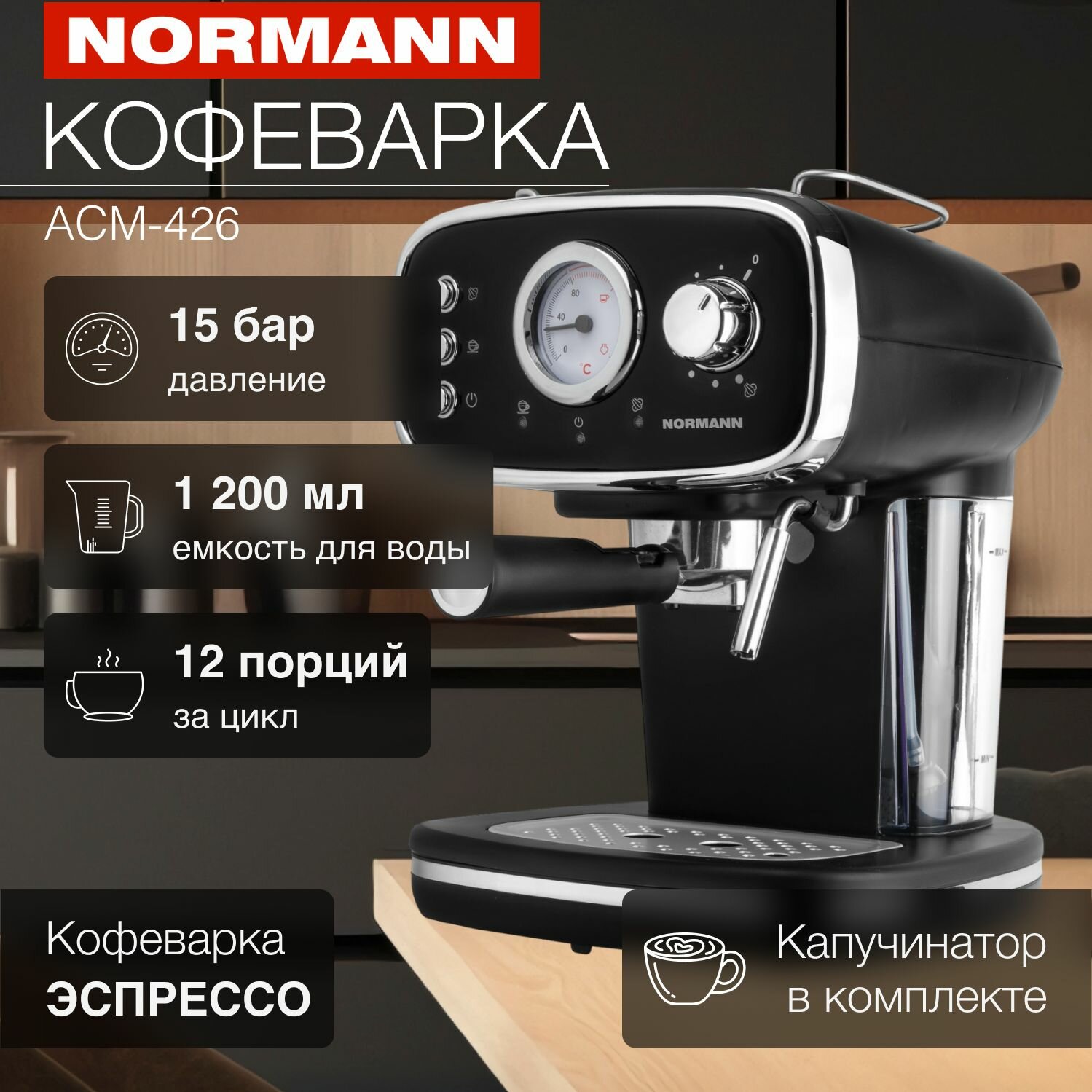 Кофеварка ACM-426 NORMANN (эспрессо; 15 бар; 1,1 кВт; 1,2 л; капучинатор)