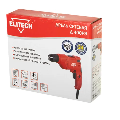 ELITECH Д 400РЭ Дрель безударная (400Вт, БЗП-10мм,0-3000об\м,1.2кг, кор, мет. клипса)