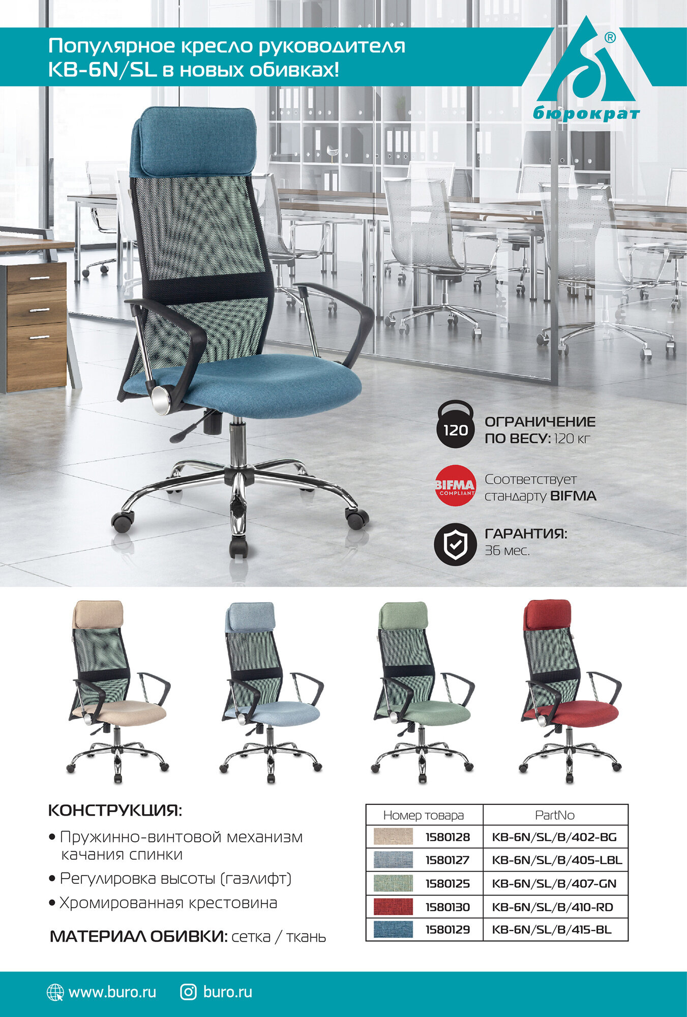 Кресло руководителя бюрократ KB-6N, на колесиках, сетка/ткань, голубой [kb-6n/sl/b/405-lbl]