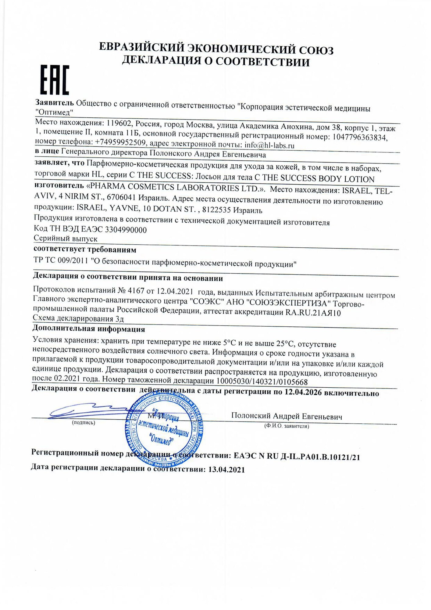 Восстановление + уменьшение воспаления + коррекция фото- и хроностарения кожи Holy Land С THE SUCCESS BODY LOTION