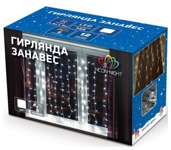 Гирлянда новогодняя светодиодная Neon-Night Дождь-штора 144 LED, 1,5х1,5м с контроллером, холодное белое свечение