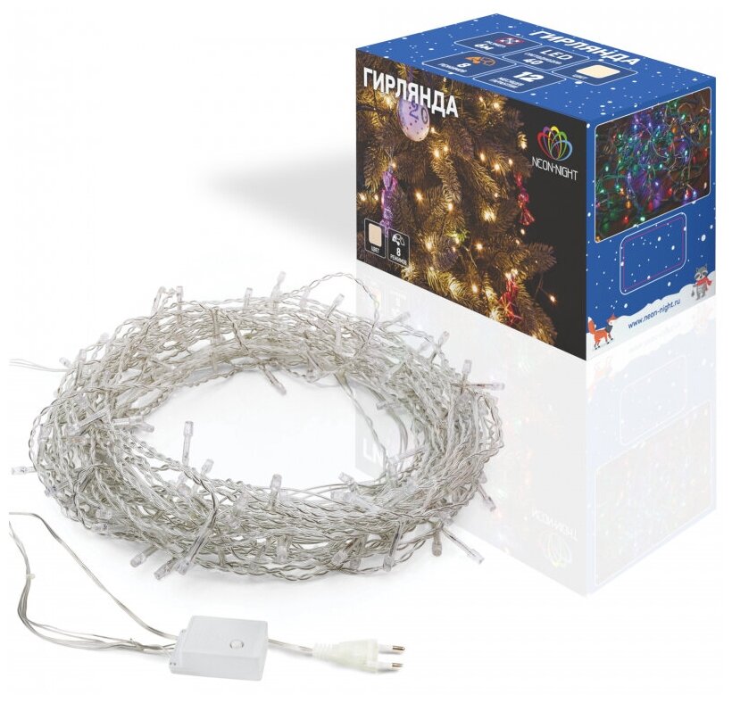 Электрогирлянда новогодняя NEON-NIGHT 303-186, 10 м, 80 ламп, теплый белый