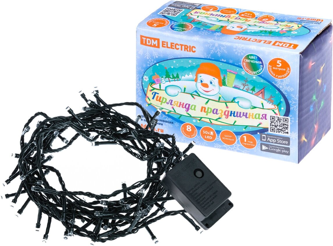 Светодиодная гирлянда TDM ELECTRIC светодиодная СГ50MЗ5, многоцвет., зеленый шнур, 5м, 8 режимов, 250 В