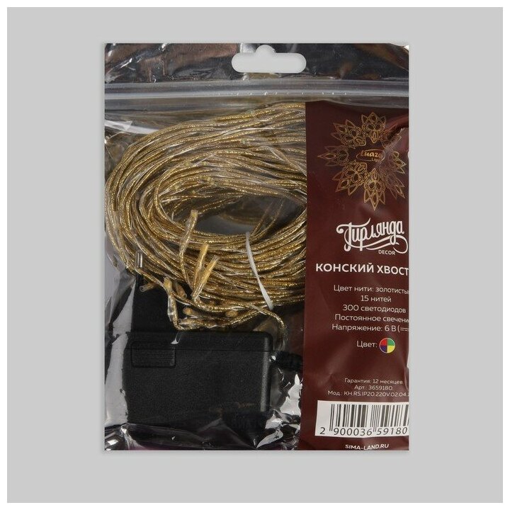 Электрогирлянда LUAZON LIGHTING Конский хвост 15 нитей по 2 м , IP20, золотистая нить, 300 LED, свечение мульти, фиксинг, 220 В