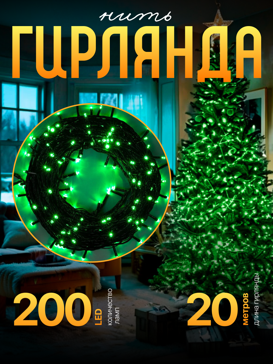 Гирлянда Luazon Lighting Нить 3556813/3556817/3556820, 20 м, 200 ламп, зеленый/черный провод