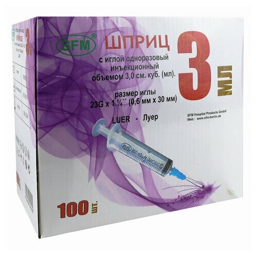 Шприц 3-х компонентный SFM, 3 мл, комплект 100 шт., в коробке, игла 0.6×32 мм - 23G