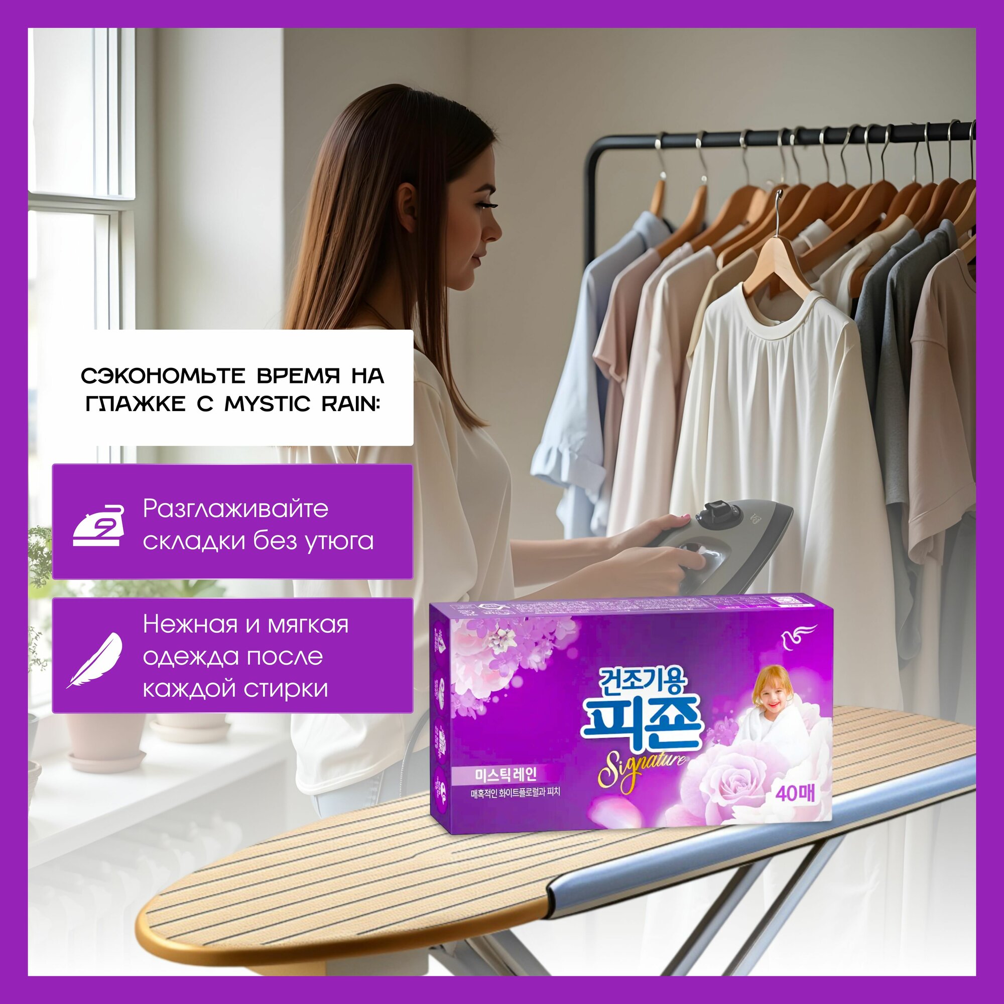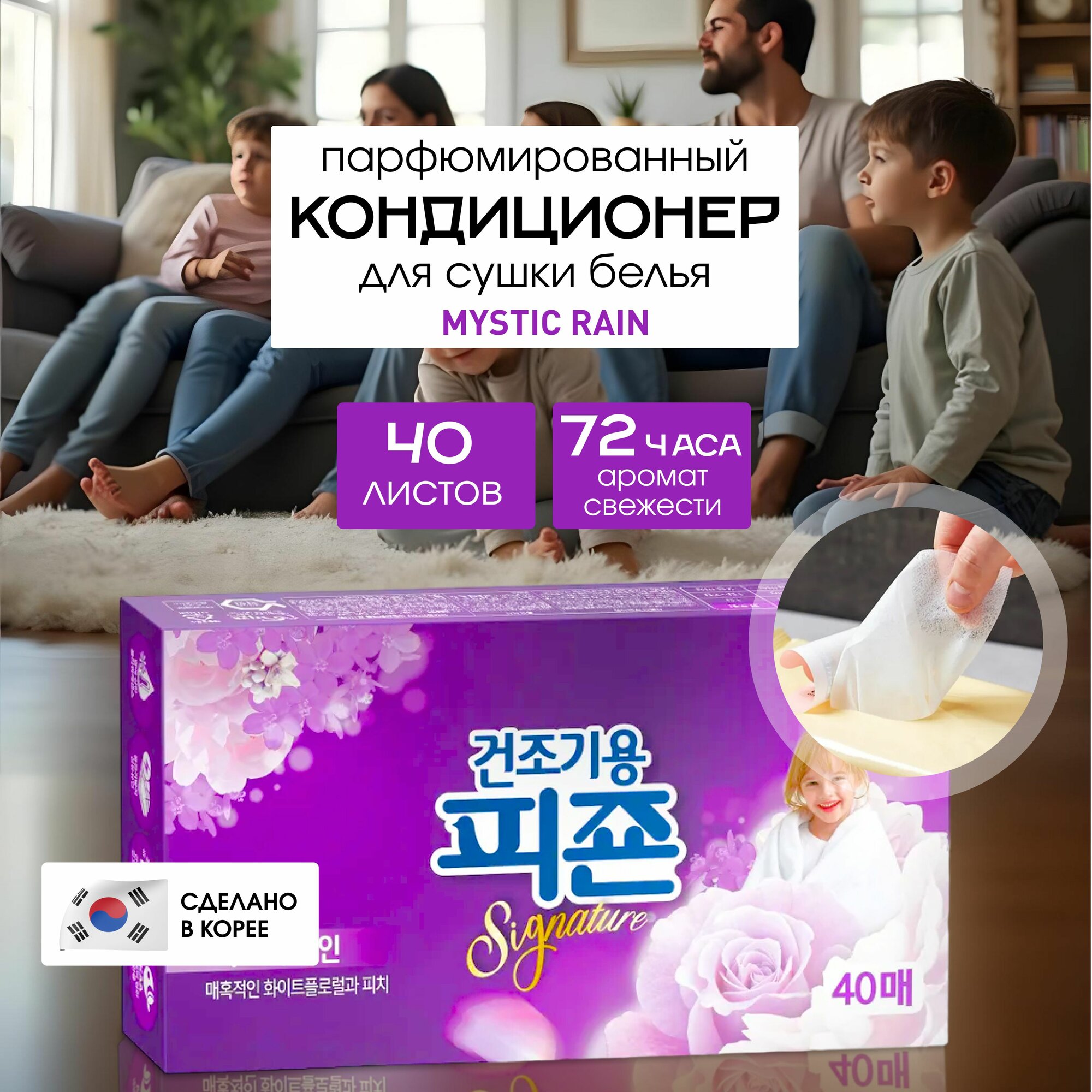 Pigeon Кондиционер листовой для белья (для сушильных машин), аромат Mystic Rain, 40 листов, Корея / Ароматизатор-салфетки для белья концентрированные