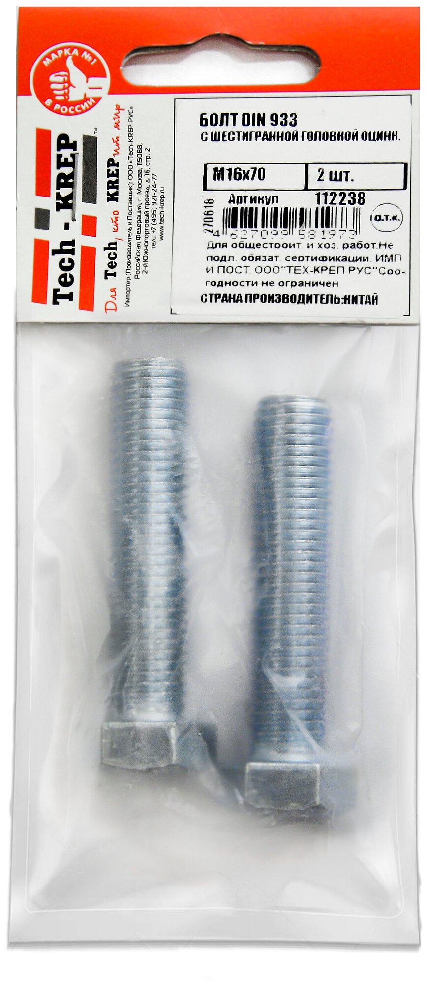 Tech-Krep Болт DIN933 с шестигранной головкой оцинк. М16x70 2 шт - пакет 112238