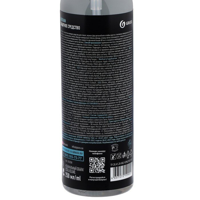 Антидождь antirain, водо и грязеотталкивающее средство для стекол зеркал, фар автомобиля и любых других стеклянных поверхностей, 250 мл Grass 135250