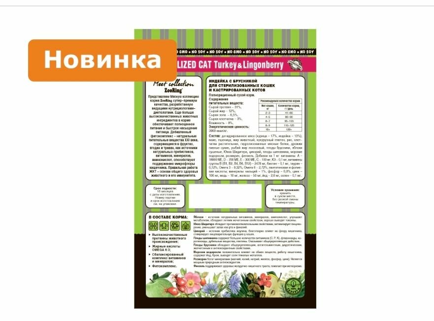Сухой корм Зооринг / ZooRing Sterilized Cat Turkey & Lingonberry для стерилизованных кошек, индейка с брусникой, 1,5 кг