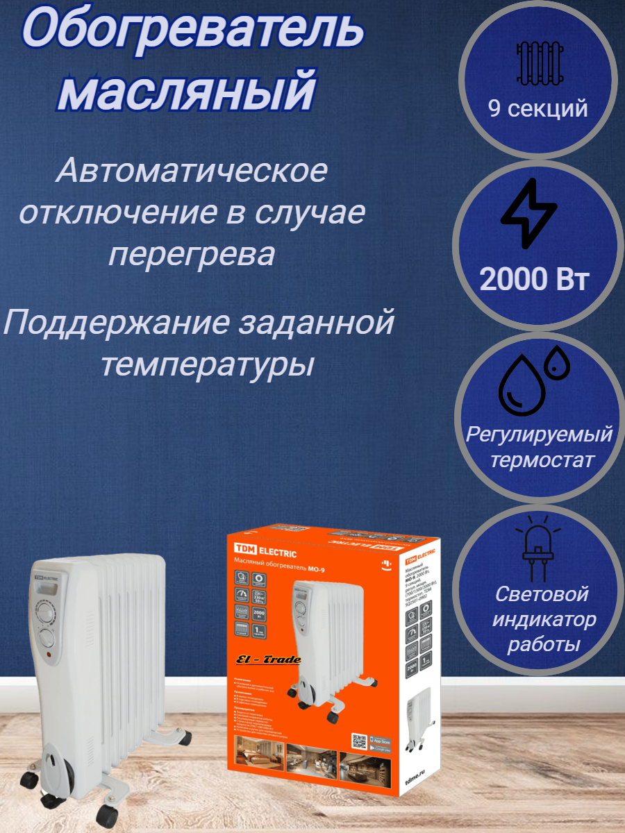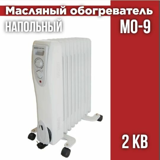 Масляный обогреватель МО-9, 2000 Вт, 9 секций, регулировочная мощность (700/1300/2000 Вт), термостат, TDM (1 шт.)