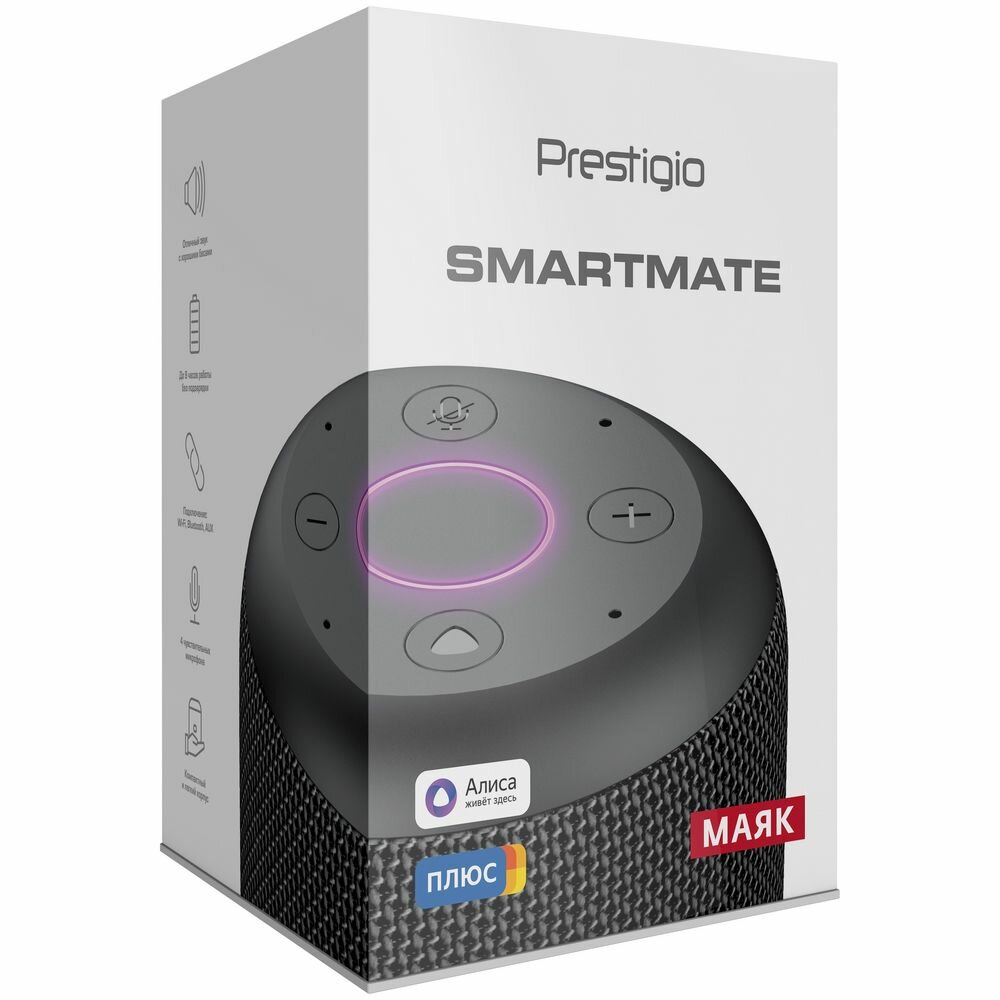 Prestigio Smartmate, smart speaker with Yandex Alisa voice assistant, built-in 7.4V@ 2x2200mAh battery, 2x3W sound power, 4 sensitive microphones, Wi-Fi/Bluetooth modes, AUX port, 3 month of Yandex.Plus included, compact design, black color.