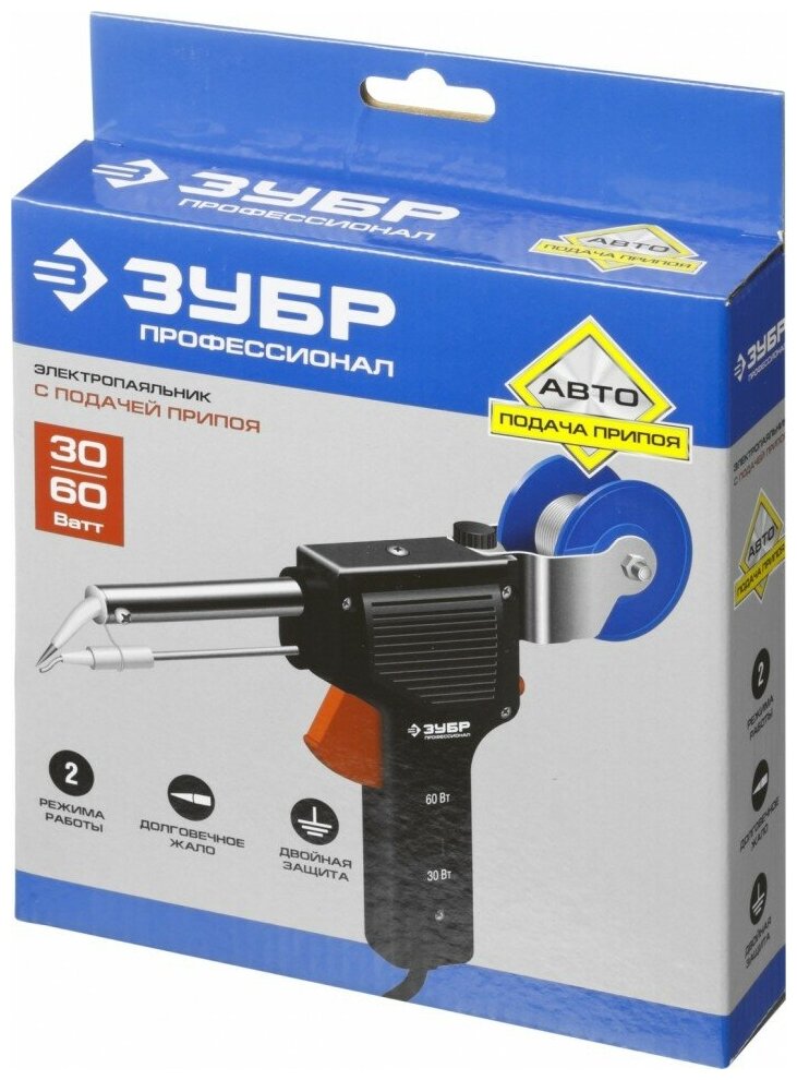 Паяльник ЗУБР "Профессионал" с подачей припоя, 2 мощности (30Вт/60Вт), диаметр проволоки припоя от 1 до 3мм