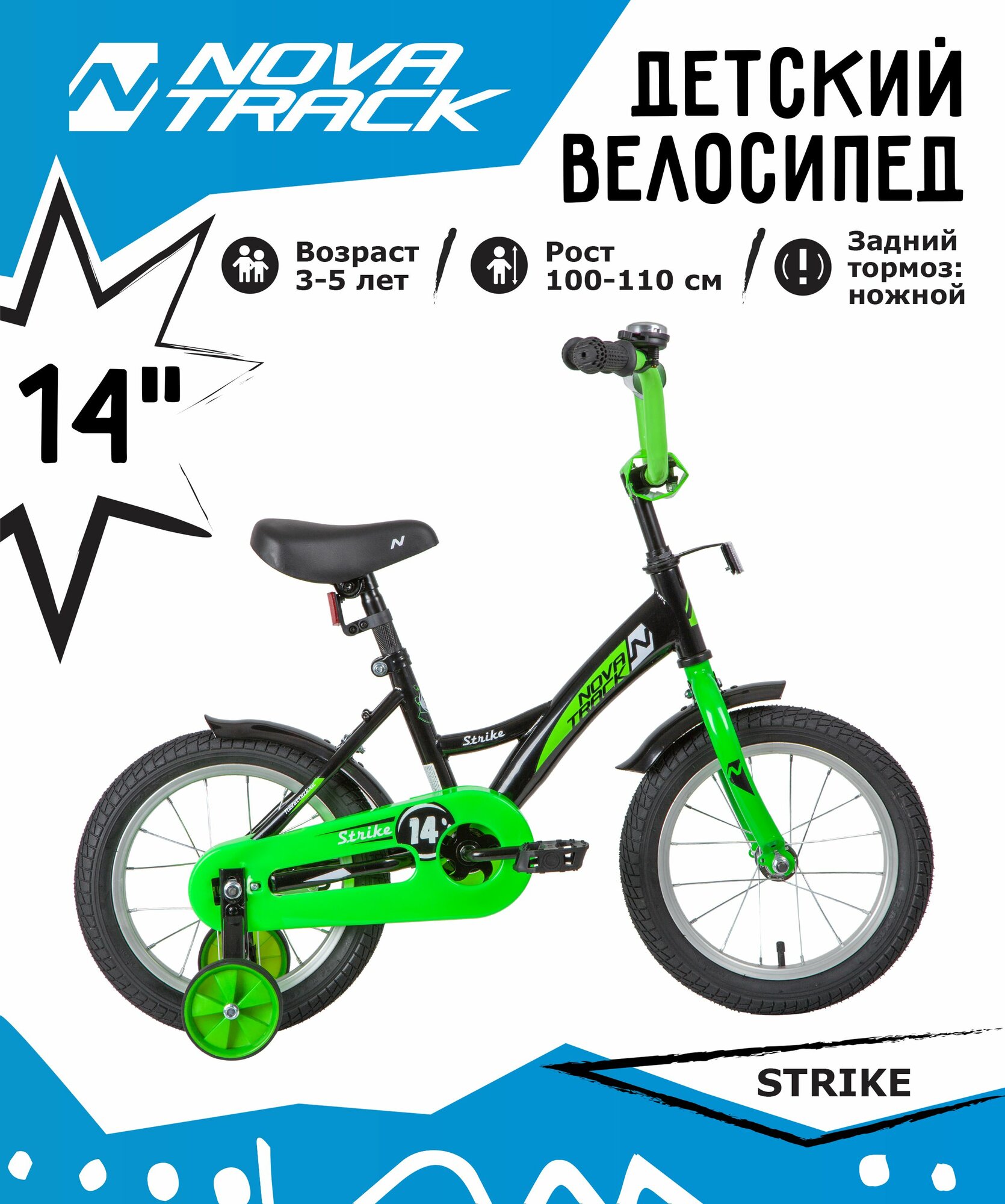 Детский велосипед NOVATRACK 14" STRIKE чёрный-зелёный, тормоз нож, крылья корот, полная защ.цепи
