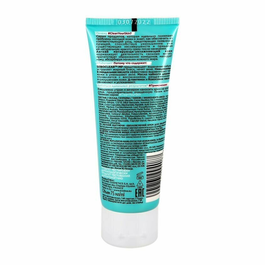 Крем для лица EVELINE CLEAN YOUR SKIN легкий матирующе-увлажняющий, 75 мл