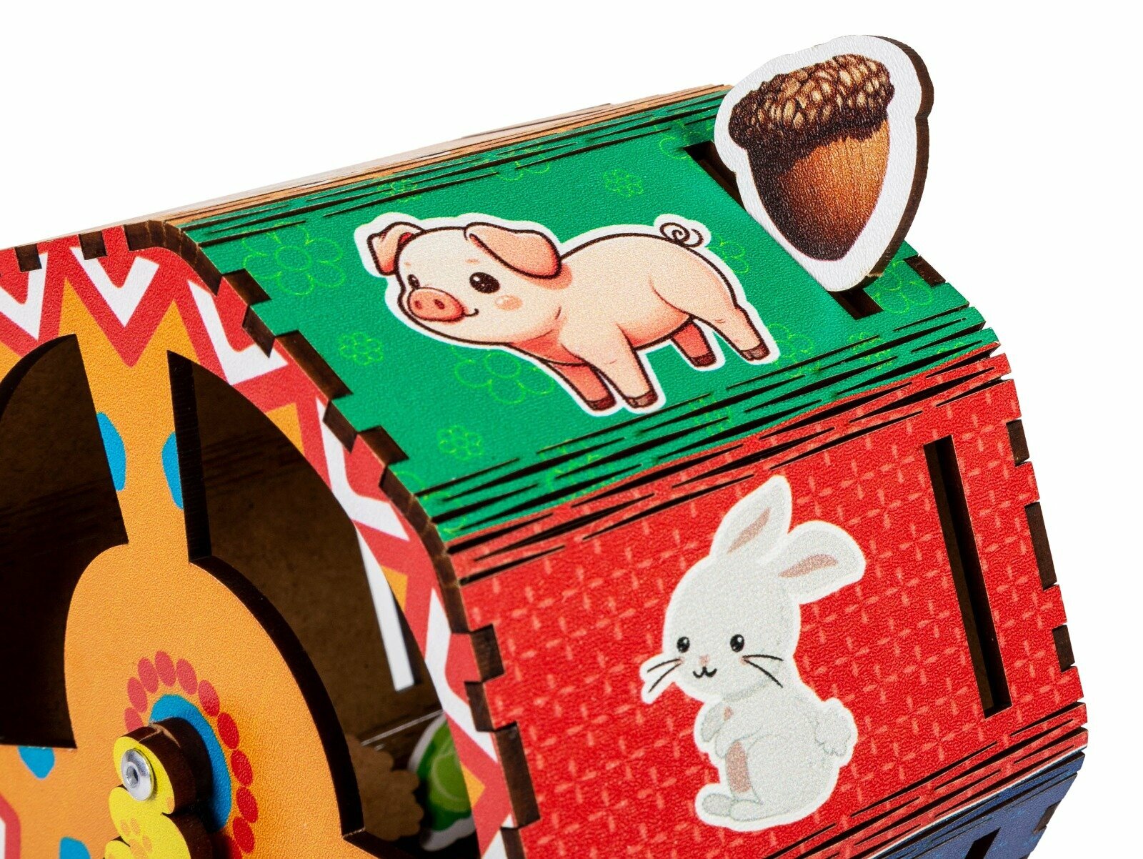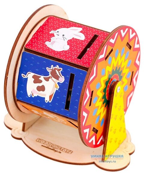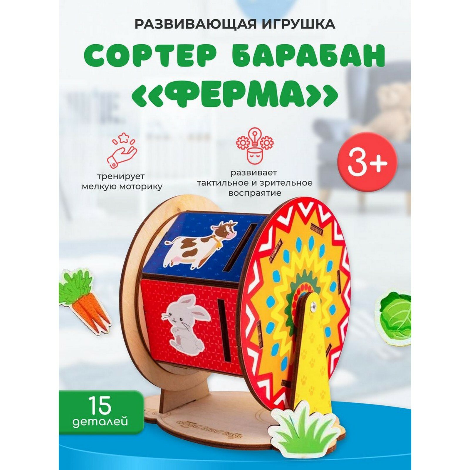 Деревянный сортер Барабан "Ферма", развивающая логическая игрушка, учим животных, 15 фишек