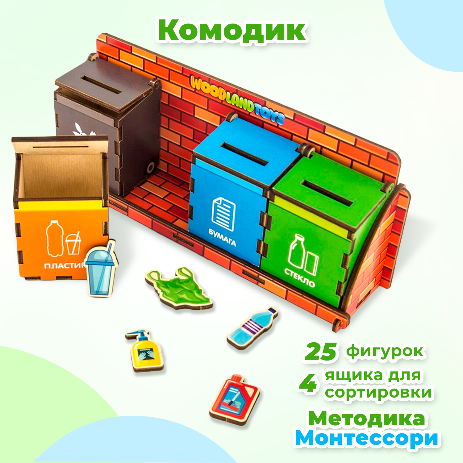СохранитьРазвивающий набор Woodlandtoys Сортер комодик Сортировка мусора 22,5*5,5*9 см 133101 интересное: