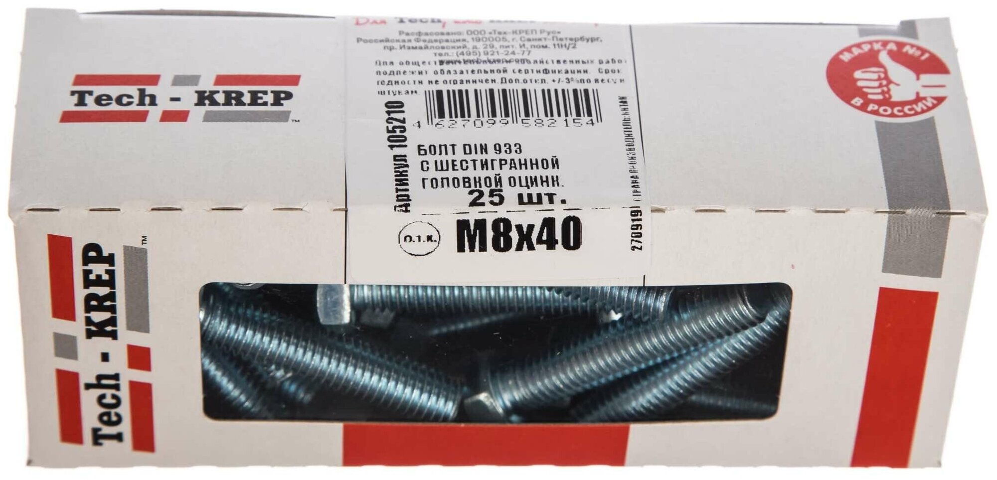 Болт Tech-Krep DIN933 с шестигранной головкой оцинк. М8х40 (25 шт) - коробка с ок. Tech-Kr 105210 10
