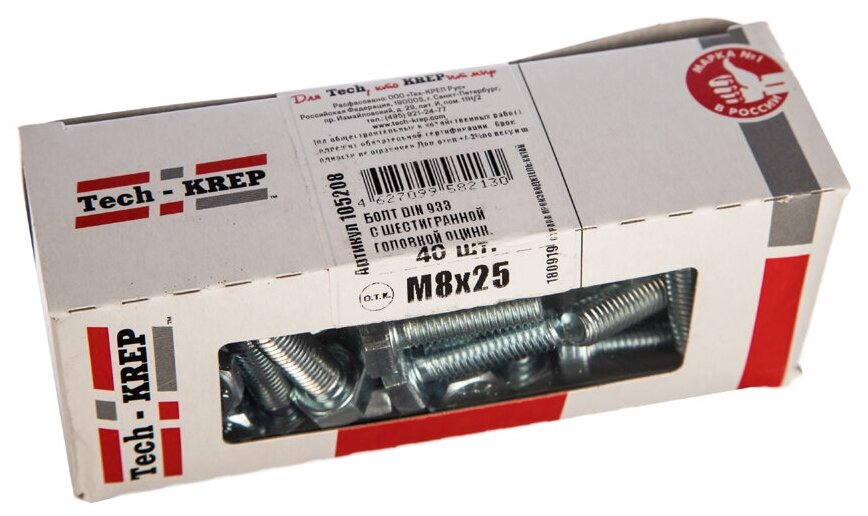 Tech-Krep Болт DIN933 с шестигранной головкой оцинк. М8х25 (40 шт) - коробка с ок. Tech-Kr 105208 10