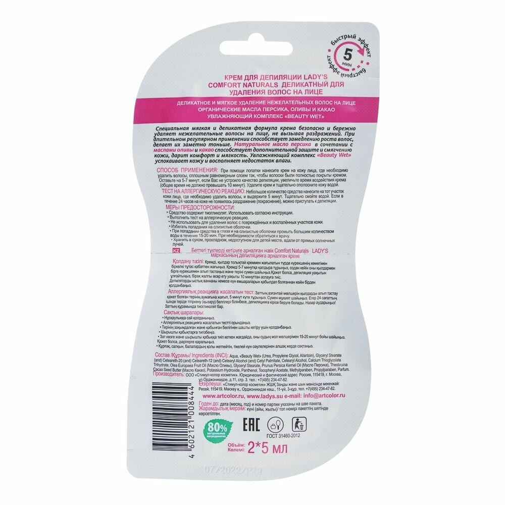 Крем для депиляции LADY S Comfort Naturals деликатный, для удаления волос на лице, 10 мл