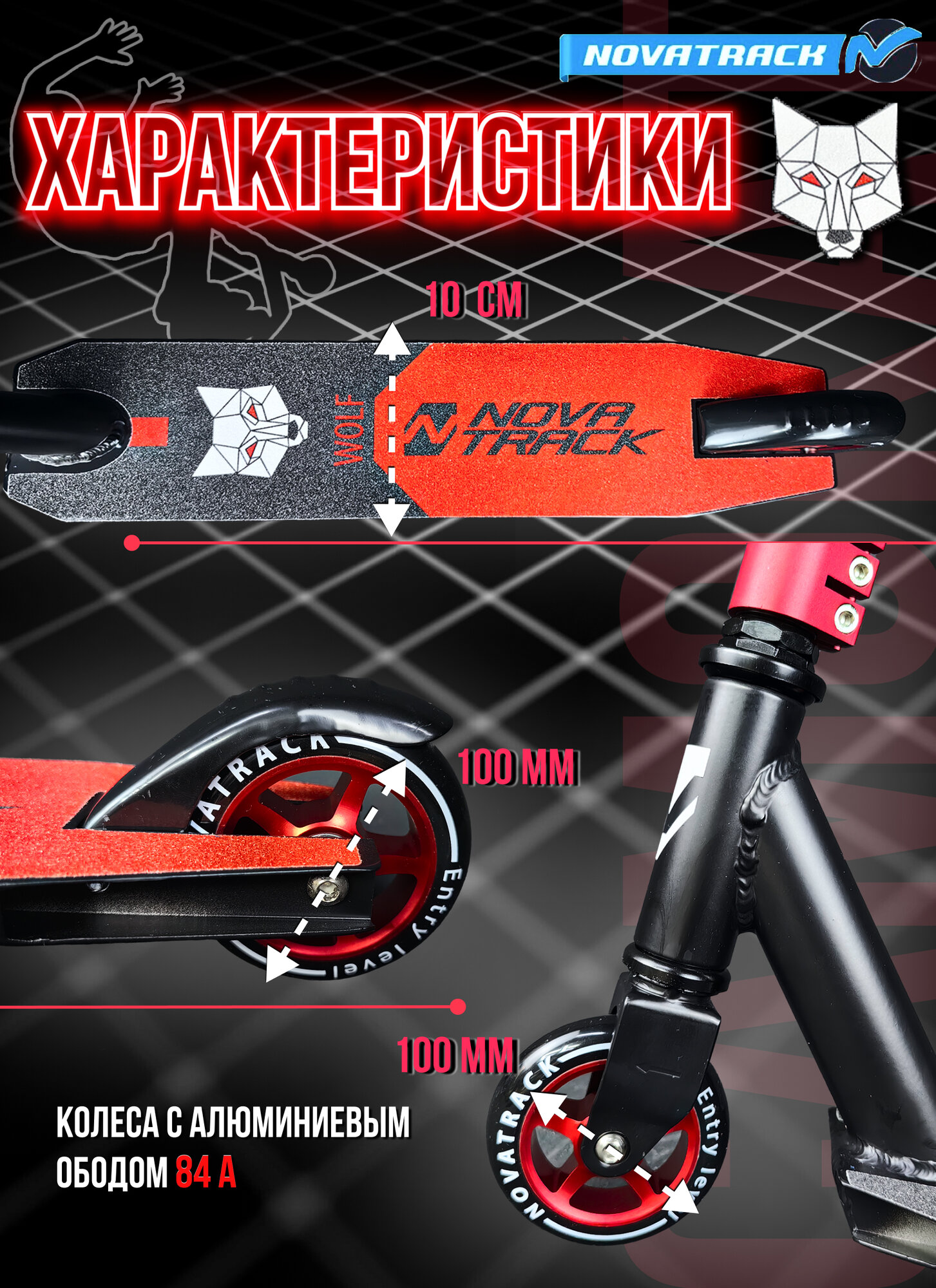 Самокат трюковый NOVATRACK 100A.WOLF.BRD20 PU колеса 100 мм с алюмин.ободом, жесткость PU 84A, abec7