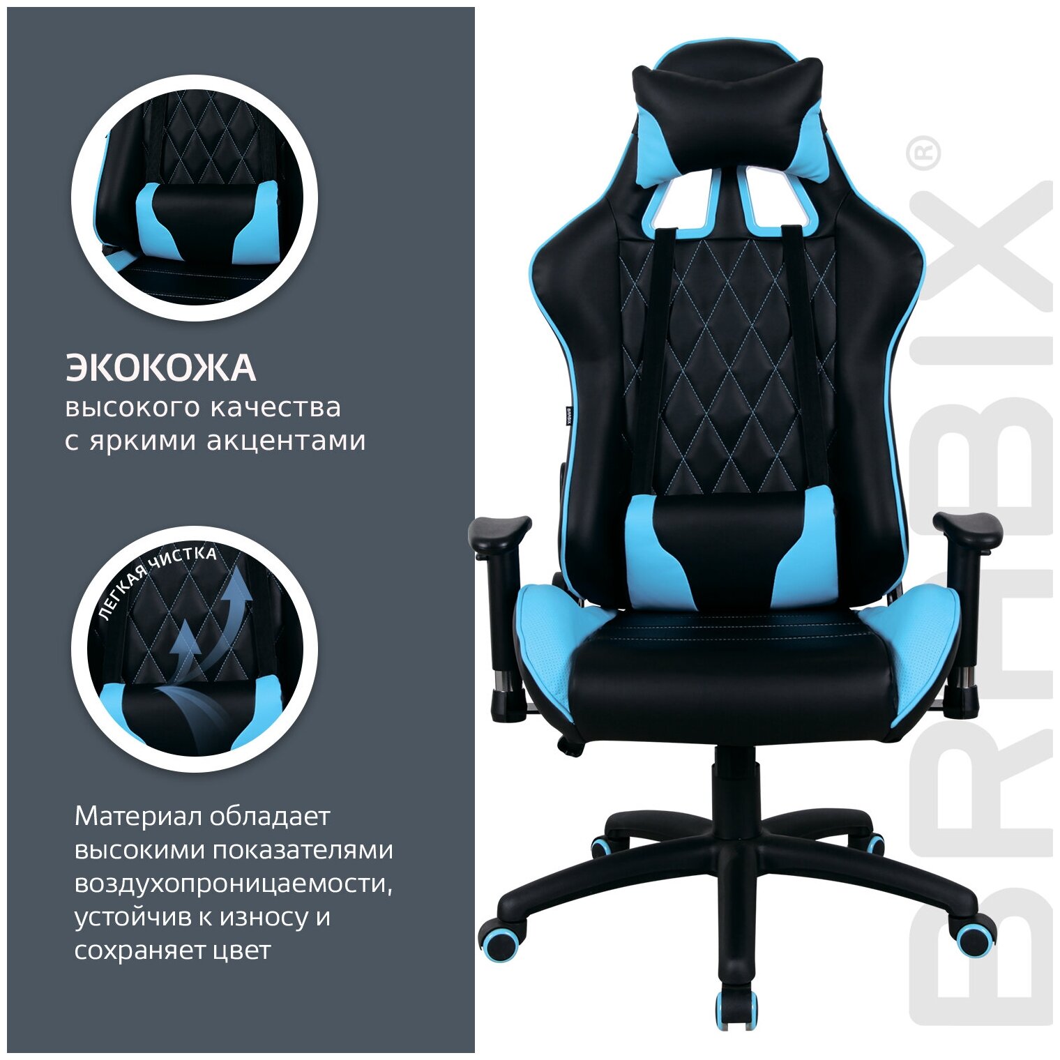 Кресло компьютерное BRABIX "GT Master GM-110", две подушки, экокожа, черное/голубое, 531928 В комплекте: 1шт.