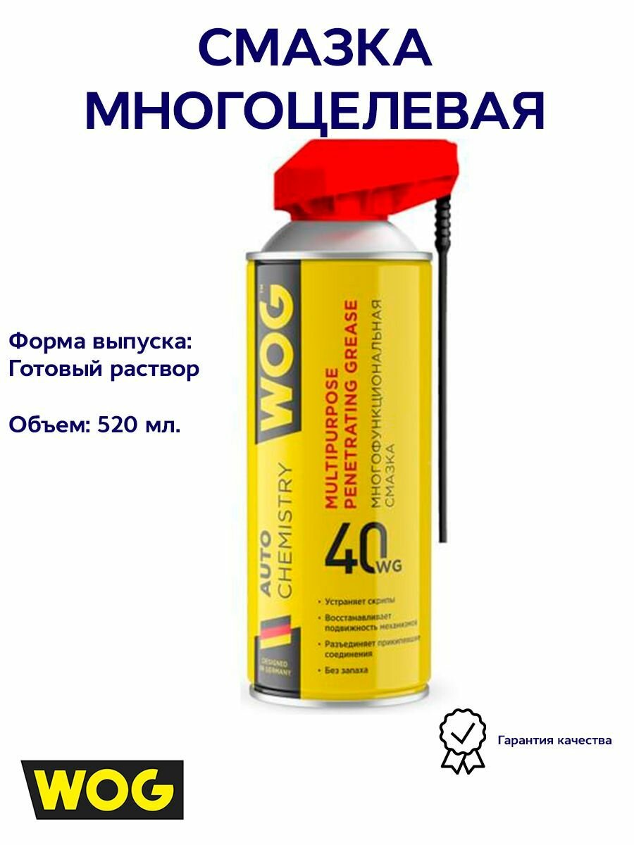 Смазка универсальная проникающая WG-40 (WD 40) многофункциональная (смазка антискрип) с профессиональным распылителем 2 в 1 WOG, 520 мл