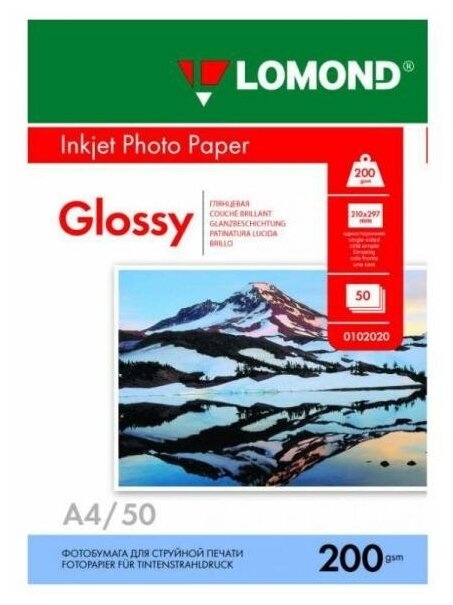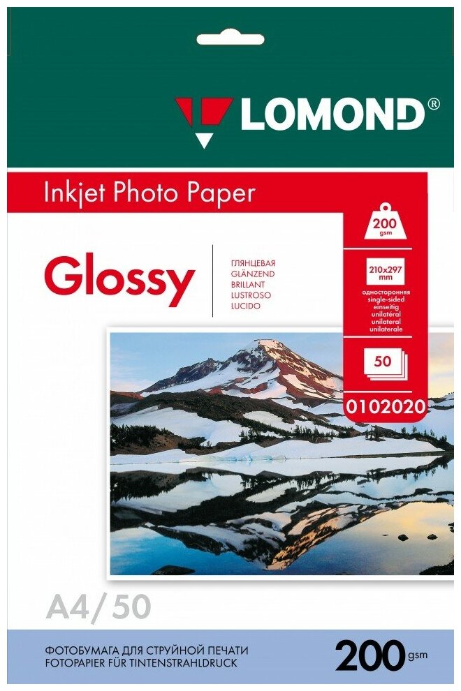 Фотобумага глянцевая, А4, 200 г/м2, односторонняя, 50 листов, LOMOND, 0102020
