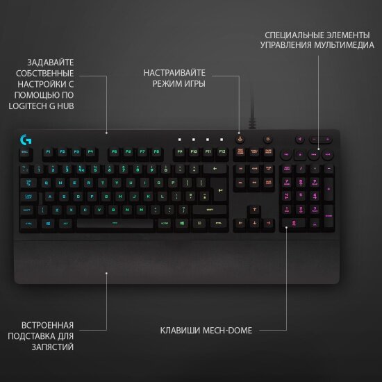 Клавиатура игровая Logitech G213 Prodigy [920-008092] черная, бесшумная, 112 клавиш (8 мультимедиа), RG-подсветка, подставка под запястья, защита от воды, USB 1,8м, {4}, (065963)